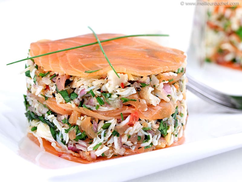 | Millefeuille saumon et fromage frais | Disques de saumon fumé alternés avec crème au fromage frais, citron et herbes | Présentation sophistiquée, texture onctueuse et saveurs fraîches |